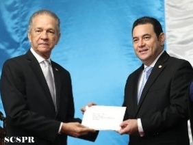 En el salon de Recepciones del Palacio de la Cultura el Presidente de la República Jimmy Morales acompañado de la Canciller Sandra Jovel, recibió cartas credenciales de diplomáticos de Brasil, Uruguay y República Dominicana. A la presentación de las mismas sostuvieron una conversación donde reafirmaron lazos de amistad y cooperación.