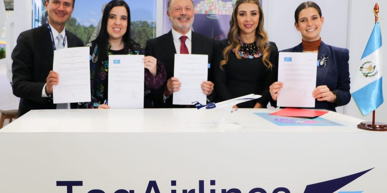 Para la firma del convenio, Marcela Toriello, Presidenta de TagAirlines, y Julio Gamero,